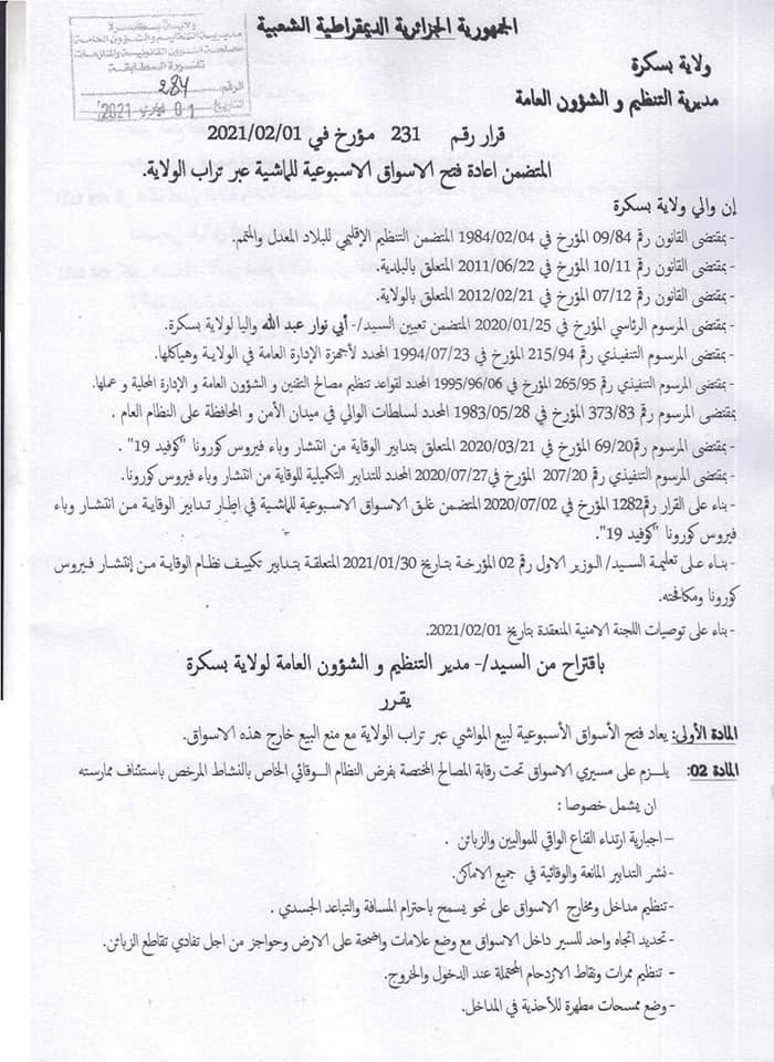 قرر والي ولاية بسكرة عبد الله ابي نوار اليوم الثلاثاء إعادة فتح أسواق الماشية عبر