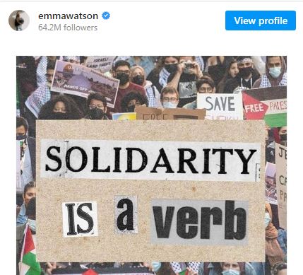 كما نشرت إيما واتسون صورة لعشرات الفلسطينيين وعليها عبارة “التضامن فعل”. حيث نقلت تدوينة للناشطة سارة أحمد، قالت فيها:”لا يفترض التضامن أن كفاحنا هو نفسه”. “أو أن ألمنا هو نفسه، أو أن أملنا في المستقبل نفسه”.