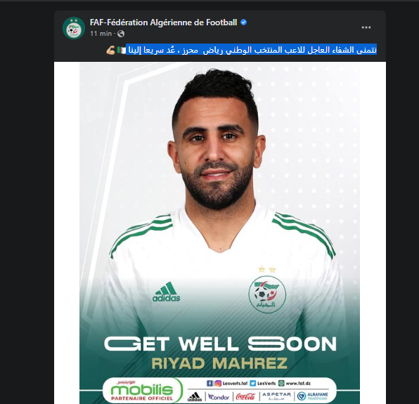 وكتبت الفاف عبر صفحتها الرسمية عبر “الفايسبوك”، اليوم الجمعة:” نتمنى الشفاء العاجل للاعب المنتخب الوطني رياض محرز ، عُد سريعا إلينا”.
