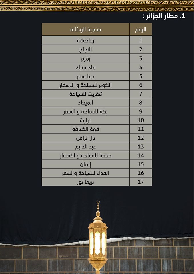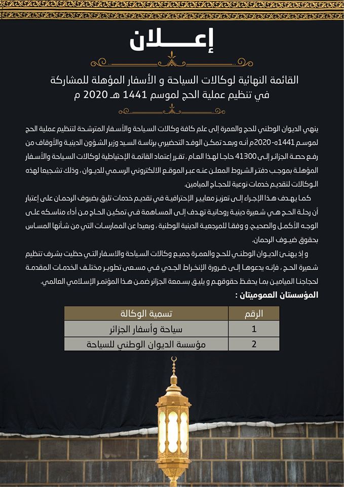 نشر الديوان الوطني للحج والعمرة القائمة النهائية لوكالات السياحة والأسفار المعتمدة لتنظيم عملية الحج للموسم 1441هـ.