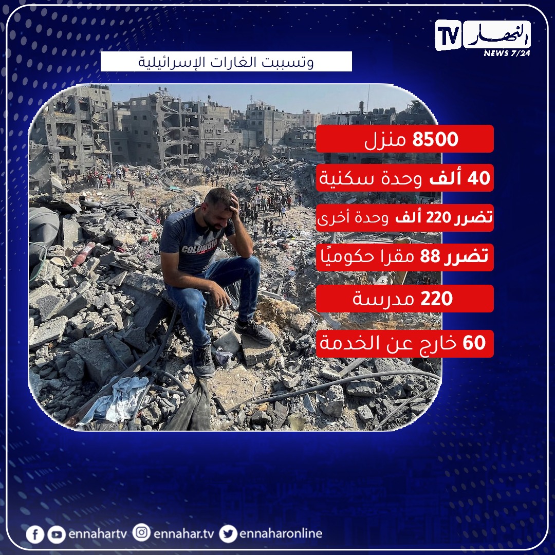 2.3 مليون نسمة باتوا نازحين قسرا.. أي ما يعادل 70 بالمئة من سكان قطاع غزة. 2 بالمئة من إجمالي سكان غزة باتوا ضحايا مباشرين جراء هذا العدوان إما شهداء أو جرحى.