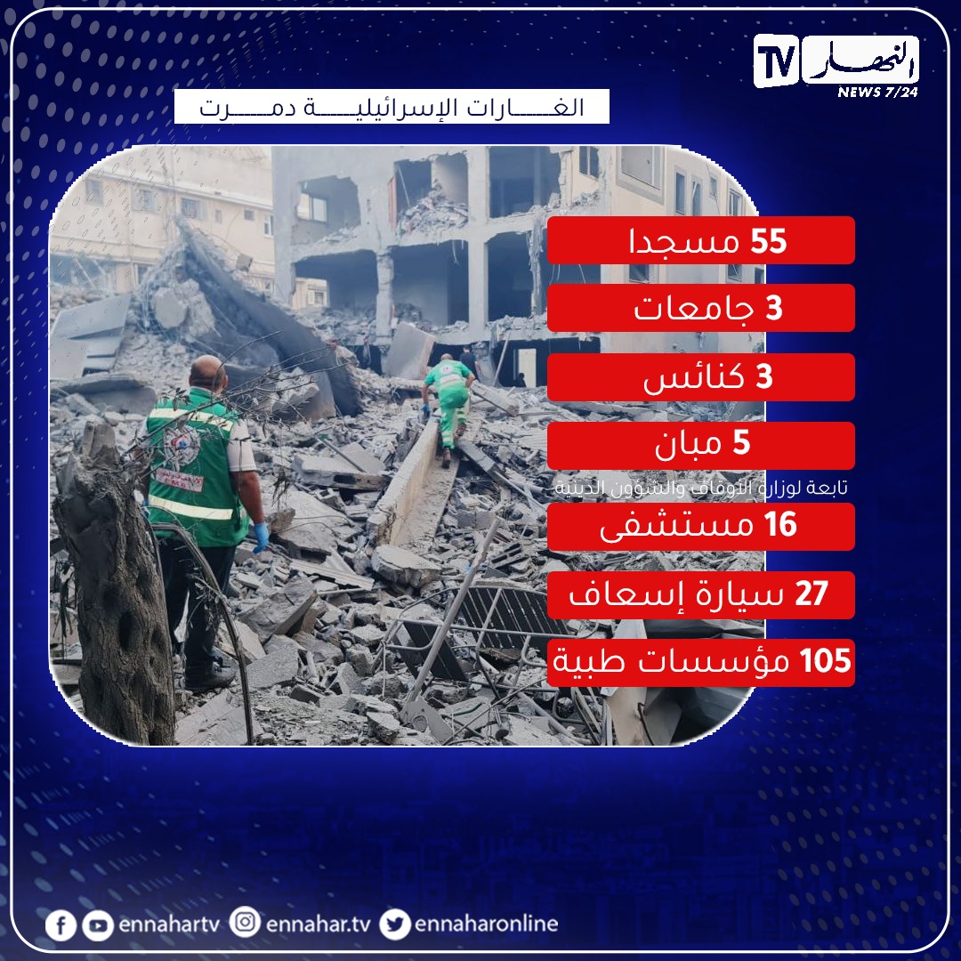 وقال المكتب الإعلامي الحكومي في قطاع غزة، أن الغارات الإسرائيلية تدمّر 55 مسجدا، و3 جامعات. و3 كنائس، و5 مبان تابعة لوزارة الأوقاف والشؤون الدينية في غزة. بالإضافة كذلك إلى تضرر 16 مستشفى، و32 مركز رعاية أولية، و27 سيارة إسعاف، بالإضافة إلى 105 مؤسسات طبية.
