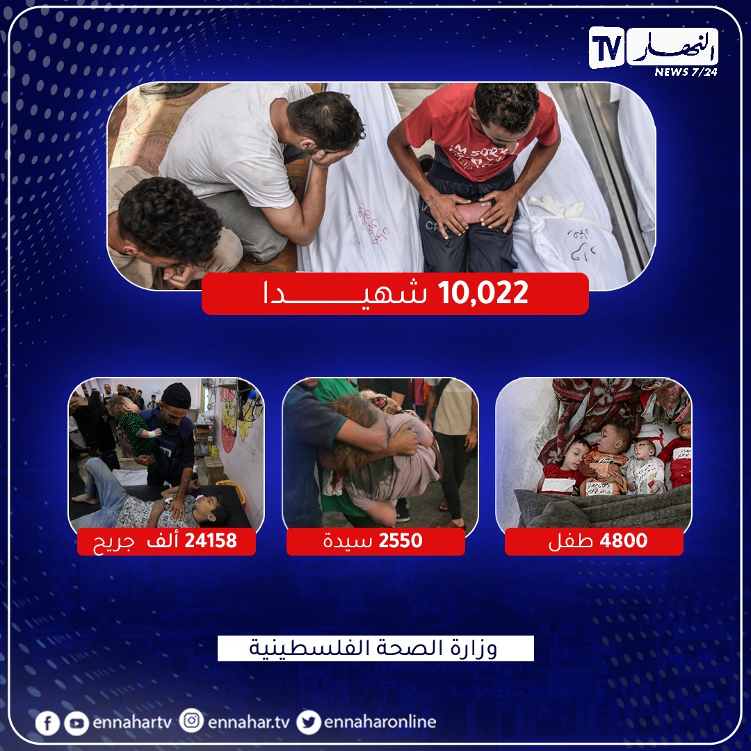 أعلنت وزارة الصحة الفلسطينية عن إرتفاع حصيلة العدوان الإسرائيلي إلى 10022 شهيدا على الأقل. بينهم 4800 طفل و2550 سيدة، وإصابة 24158 ألف بجروح مختلفة.