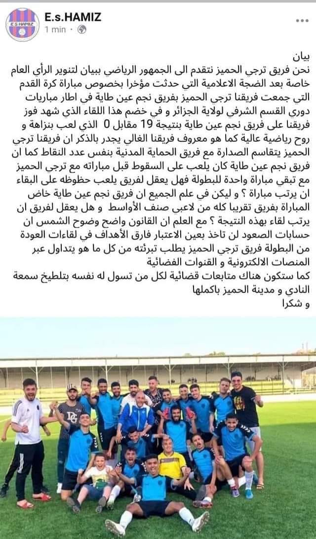 وأوضح ذات البيان:”فريق نجم عين طاية كان يلعب على السقوط قبل مباراته مع ترجي الحميز  مع تبقي مباراة واحدة للبطولة”.