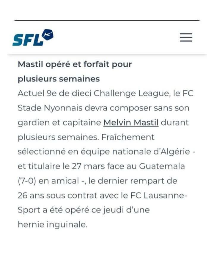 وأشار موقع “SFL” السويسري، أن ماستيل، الذي غاب عن لقاء ناديه السبت الماضي أمام بيلينزونا، ضمن فعاليات الجولة الـ 31 من الدرجة الثانية السويسرية. سيبقى بعيدا عن المنافسة لعدة أسابيع، من دون منح تاريخ محدد لعودته.