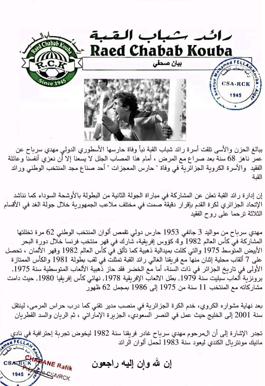 الإدارة القباوية نشرت بيانا رسميا قدمت من خلاله تعازيها الخالصة لأسرة كرة القدم الجزائرية إثر وفاة أسطورة حراسة المرمى مهدي سرباح اليوم الجمعة بعد صراع مع مرض عضال.