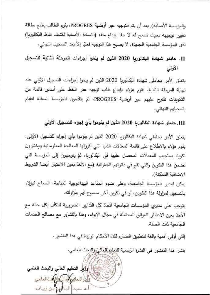 كما أوضحت وزارة التعليم العالي أن حاملي شهادة البكالوريا 2020، والذين لم يتموا إجراءات المرحلة الثانية من التسجيل الأولي، يتعين عليهم إيداع طلب توجيه عبر الخط على أساس قائمة من التكوينات تقترح عليهم عبر ارضية PROGRES.