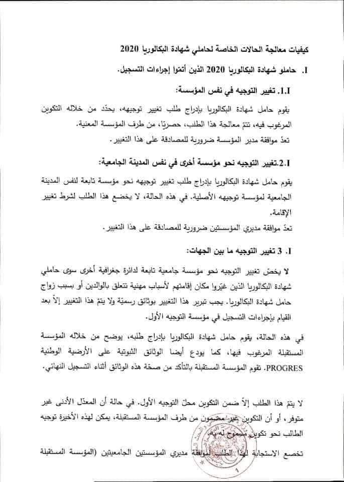 وأشارت الوزارة أن حاملو شهادة البكالوريا 2020 الذين أتموا إجراءات التسجيل، والذين يريدون إجراء تغيير التوجيه في نفس المؤسسة، عليهم بإدراج طلب تغيير التوجيه، يحدد من خلاله التكوين المرغب فيه، وستتم معالجة هذا الطلب حصريا من طرف المؤسسة المعنية.
