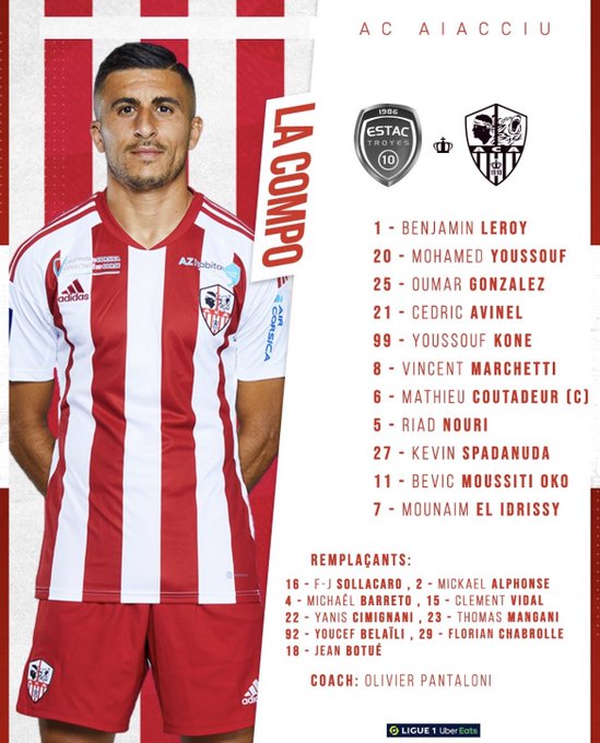 أعلن مدرب أجاكسيو عن التشكيلة الأساسية التي سيعتمد عليها أمام نادي تروا، اليوم الأحد، في الجولة 11 من عمر الليغ 1.