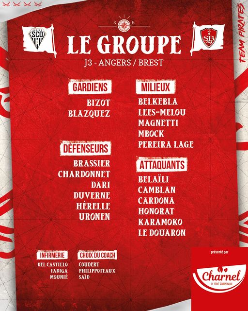 أعلن مدرب بريست الفرنسي ميشال دير زاكاريان عن قائمة 19 لاعبا المعنية لمباراة أنجي غدا ضمن مباريات الجولة 23 من الليغ 1 .