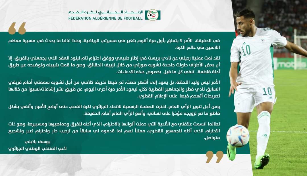 ابن ولاية وهران ومن خلال بيان نشره عبر صفحة الاتحاد الجزائري لكرة القدم قال:”لقد تمت عملية رحيلي عن بريست في إطار طبيعي، ووفق احترام تام لبنود العقد”.