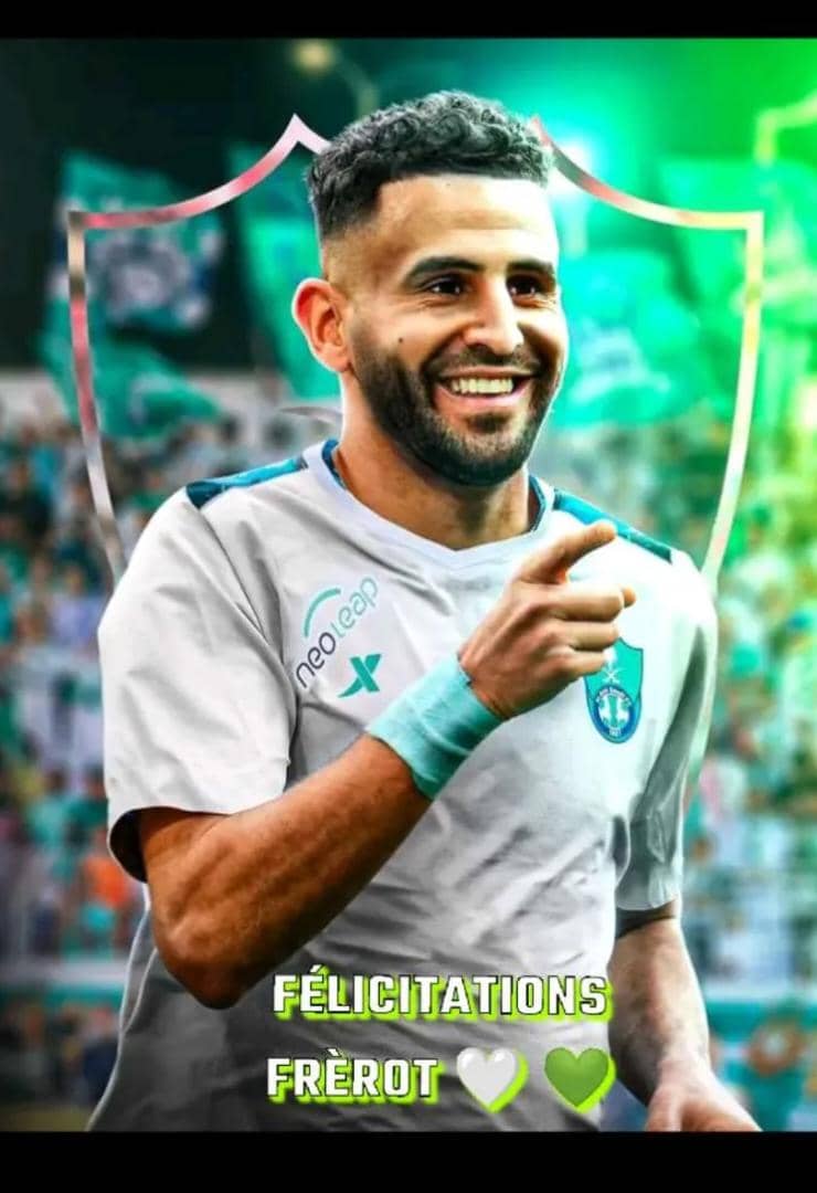 ونشر بلايلي عبر حسابه على موقع التواصل الاجتماعي، صورة مركبة لنجم المان سيتي رياض محرز، بقميص ناديه الجديد الأهلي السعودي، وعلق عليها:”مبروك أخي”.