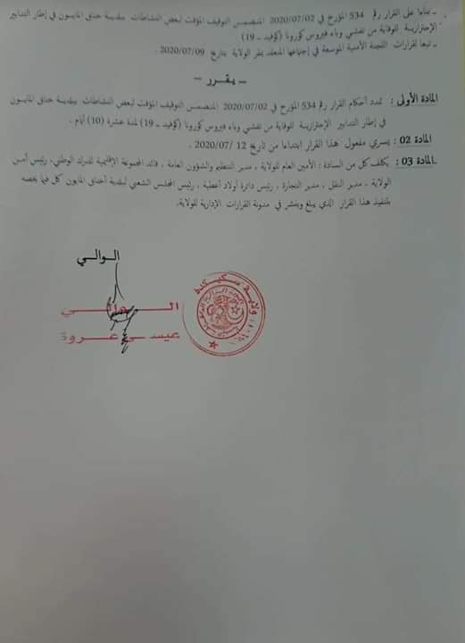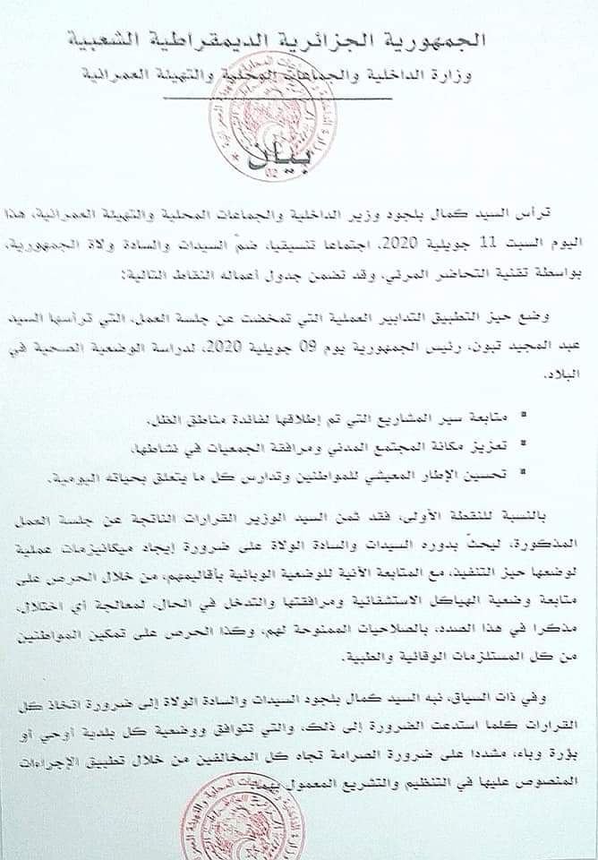 ووفق بيان الوزارة تم خلال الإجتماع وضع حيز التنفيذ التدابير التي تمخضت عن جلسة عمل برئاسة الرئيس تبون وهي: