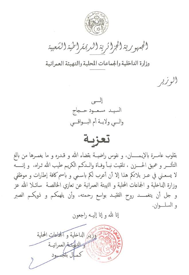 عزى وزير الداخلية كمال بلجود، والي ولاية أم البواقي مسعود حجاج على إثر وفاة والده.