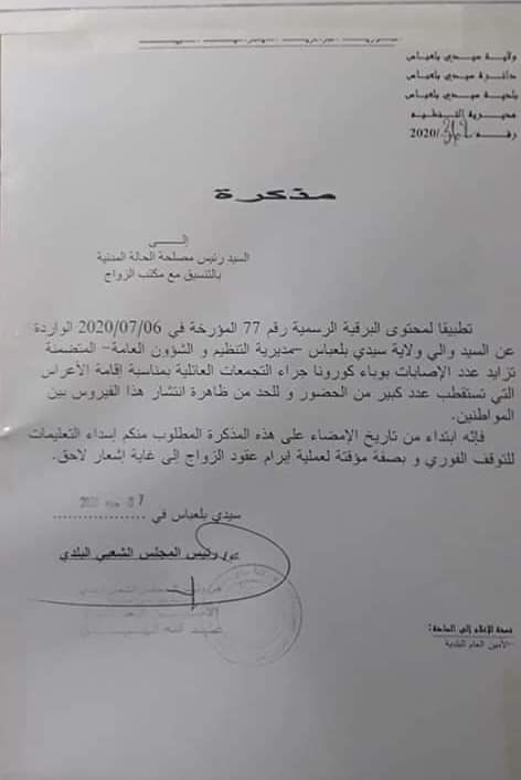 اصدرت بلدية سيدي بلعباس مذكرة الى مديرية الشؤون العامة مصلحة الحالة المدنية امر بتعليق ابرام عقود الزواج بصفة مؤقتة، ابتدا من تاريخ 08 جويلية 2020.