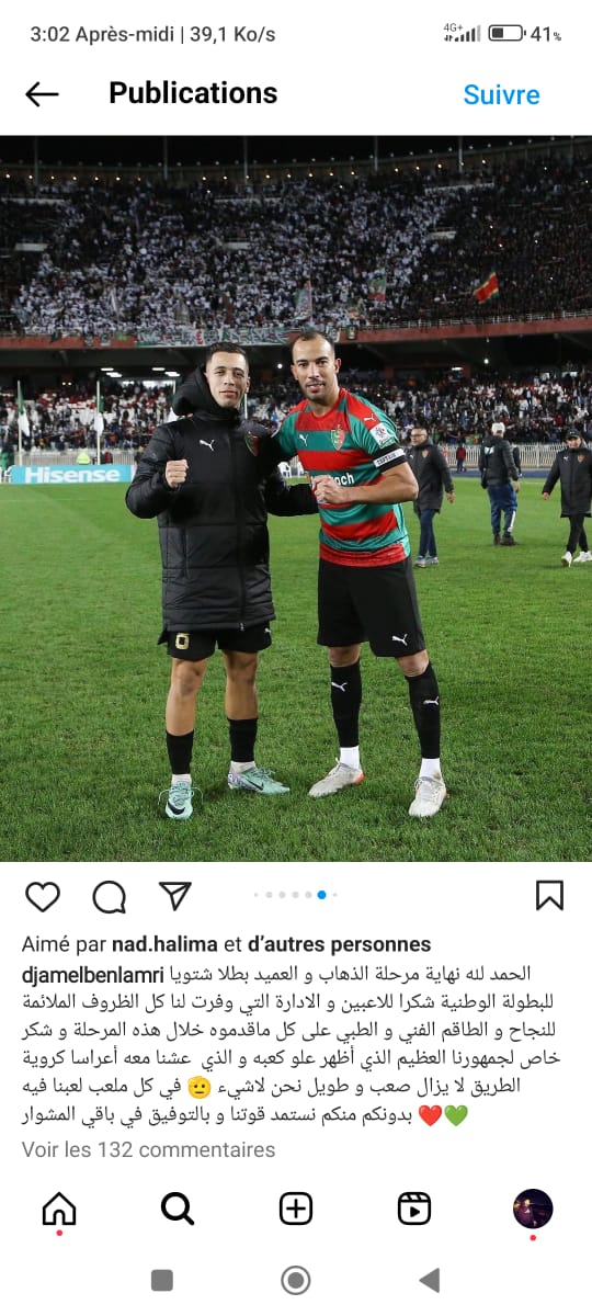 كما شكر لاعب المولودية الطاقمين الفني والطبي على كل ما قدموه خلال مرحلة الذهاب. قبل أن يوجه شكرا خاصا للشناوة. وأضاف: “شكر خاص لجمهورنا العظيم الذي أظهر علو كعبه والذي عشنا معه أعراسا كروية في كل ملعب لعبنا فيه”.