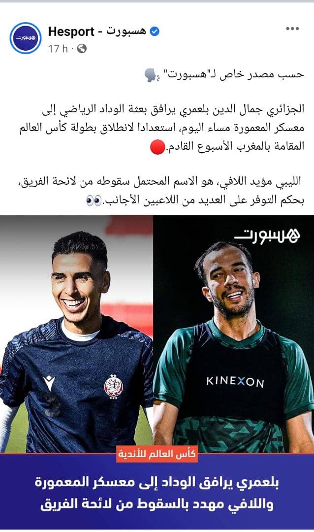 كما أضاف المصدر، أن نادي الوداد سيتخلى عن لاعبه الدولي الليبي مؤيد اللافي، حتى يتسنى له تسجيل اللاعب بلعمري.