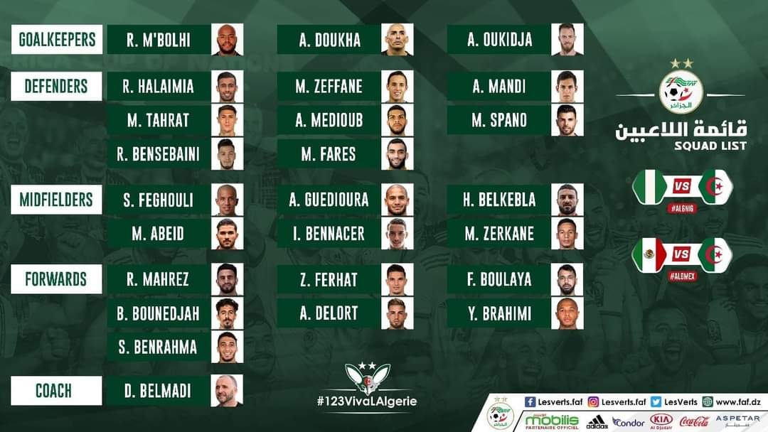 بلماضي لم يستدع يوسف عطال وكذا هشام بوداوي بسبب الإصابة، بينما أعاد مهدي زفان فريد بولاية وزين الدين فرحات للقائمة مجددا.