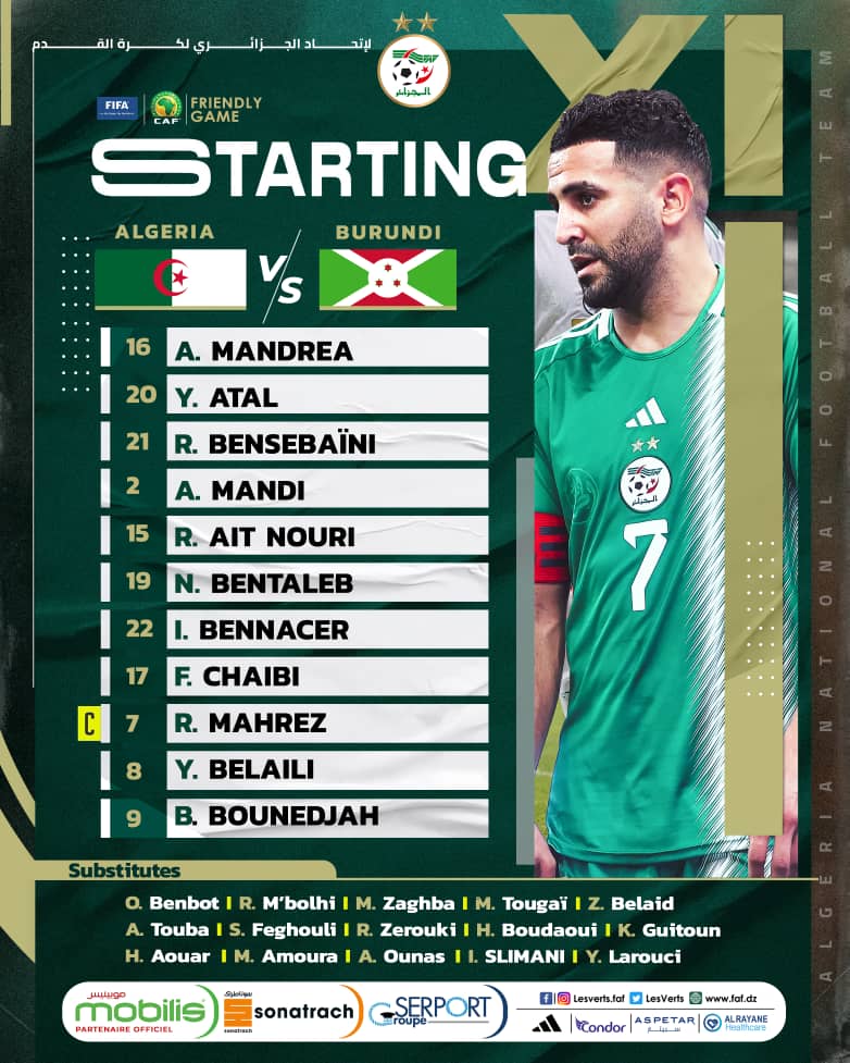 كشف الناخب الوطني، جمال بلماضي، عن التشكيلة الأساسية التي اختارها لمباراة اليوم الودية، أمام منتخب بورندي.