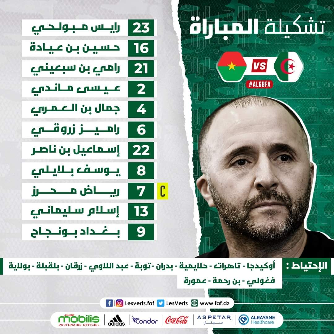 كشف الناخب الوطني جمال بلماضي عن التشكيلة الأساسية التي سيدخل بها مباراة اليوم أمام منتخب بوركينافاسو بملعب مصطفى تشاكر.