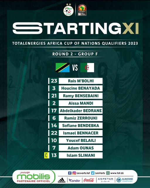كشف الناخب الوطني جمال بلماضي عن التشكيلة الأساسية التي سعيتمد عليها في مباراة اليوم امام المنتخب المستضيف تنزانيا في تصفيات كان كوت ديفوار.