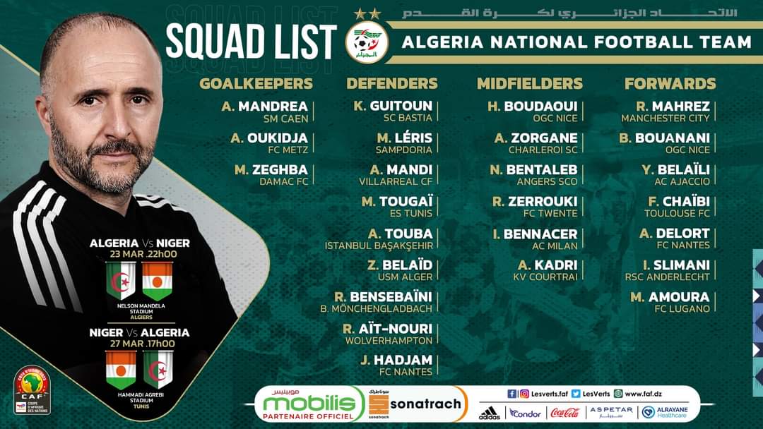 كشف الناخب الوطني جمال بلماضي، اليوم الخميس، قائمة اللاعبين المعنيين بتربص مارس الجاري، والذي تتخلله مواجهتي النيجر.