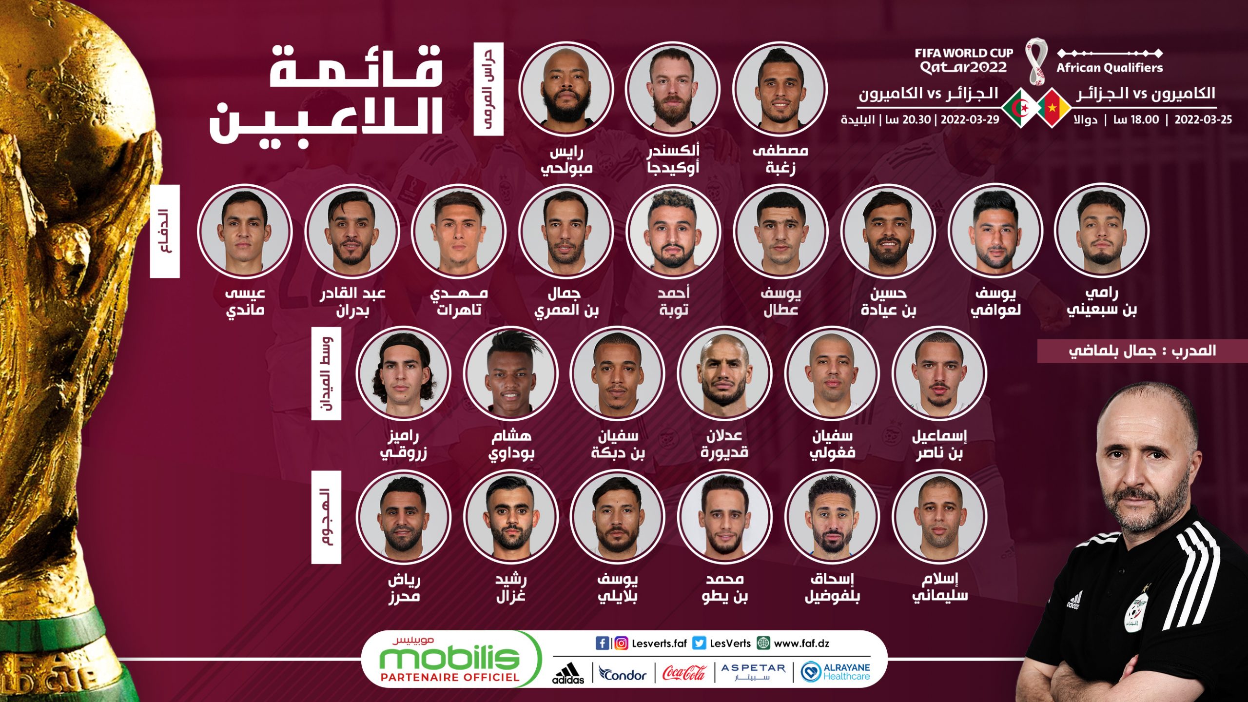 كشف الناخب الوطني جمال بلماضي، اليوم السبت، قائمة اللاعبين المعنيين بمبارتي السد، أمام الكاميرون، والمؤهلة لمونديال قطر.