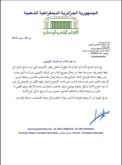اعتبر النائب عن الجالية الجزائرية بلمداح نور الدين، تصريح النائب عن البرلمان الاوروبي ماريا أرينا، تدخلا علنيا بالشأن الجزائري.