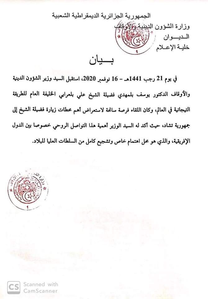 إستقبل اليوم الإثنين وزير الشؤون الدينية والأوقاف يوسف بلمهدي اليوم الشيخ علي بلعرابي الخليفة العام للطريقة التيجانية في العالم.