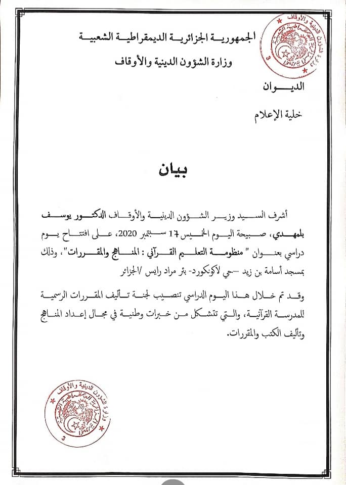 أشراف وزير الشؤون الدينية والأوقاف يوسف بلمهدي اليوم بالعاصمة على تنصيب لجنة تأليف المقررات الرسيمة للمدارس القرآنية.