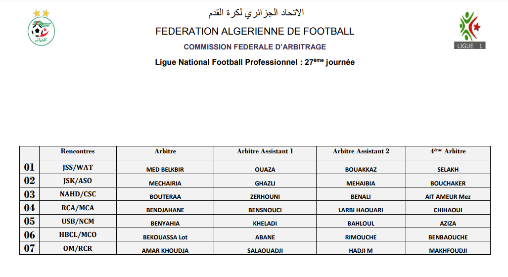 وسيدير الحكم بن جهان، هذه المواجهة بمساعدة بن سنوسي، مساعد أول، ولعربي هواري، مساعد ثاني، بالإضافة شيهاوي حكم رابع.