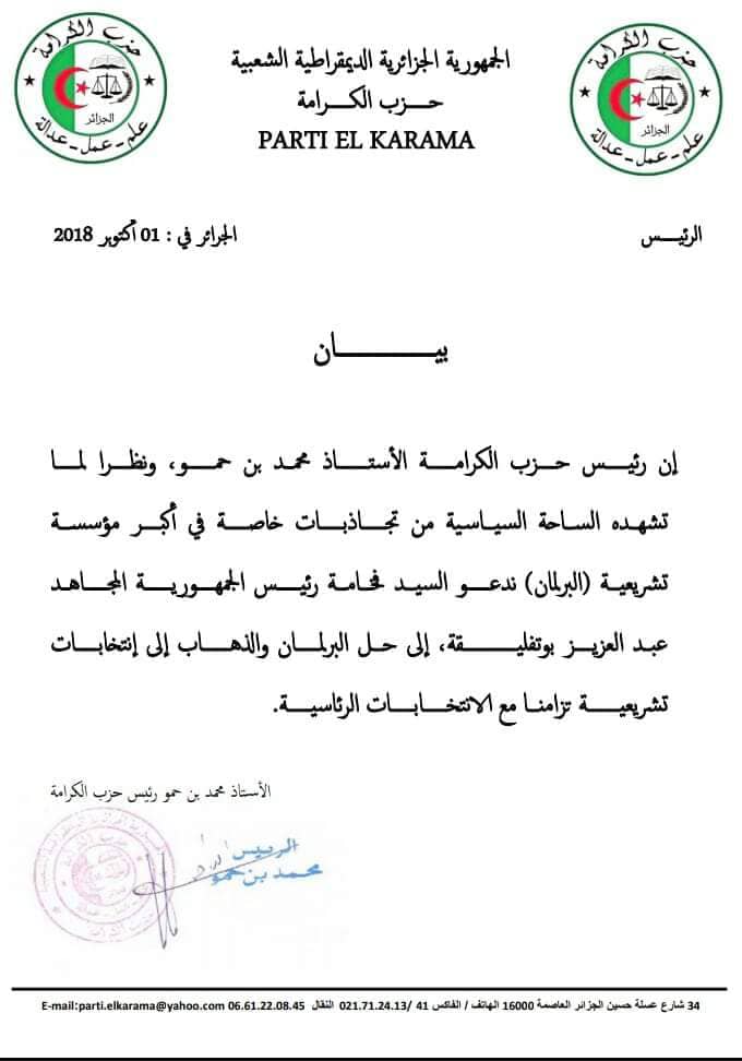 دعى رئيس حزب الكرامة محمد بن حمو رئيس الجمهورية عبد العزيز بوتفليقة الى حل البرلمان والذهاب الى انتخابات تشريعية تزامنا مع الانتخابات الرئاسية.