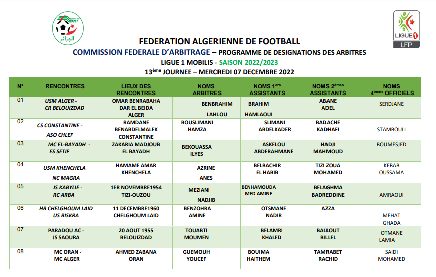 كما كشف الموقع الرسمي للاتحاد الجزائري لكرة القدم، تعيينات باقي حكام مباريات هذه الجولة، والتي جاءت كاملة على النحو التالي: