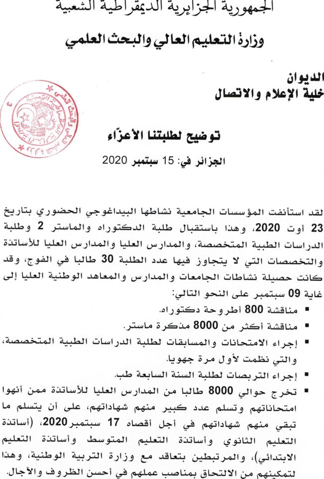 نشر وزير التعليم العالي والبحث العلمي، عبد الباقي بن زيان بيان توضيحيا في صفحتة الرسمية في فايسبوك.