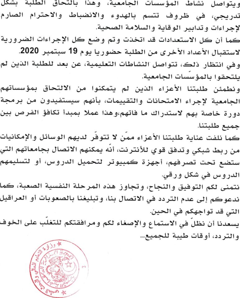 وثال الوزير في بيانه ان الجامعات استأنفت نشاطها البيدغوجي بتاريخ 23 أوت الماضي، من خلال استقبال طلبة الدكتوراه و ماستر2 وطلبة الطبية المتخصصة والمدارس العليا والتخصصات التي لا تتجاوز بها عدد الطلبة 30 طالبا في الفوج.