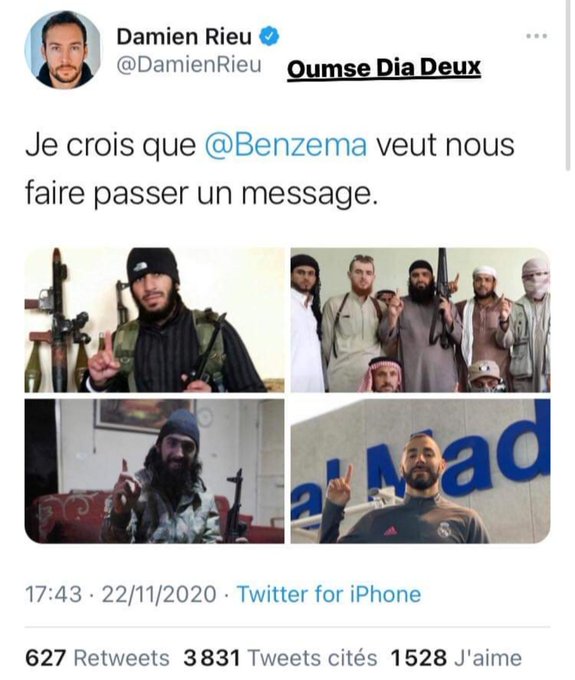 وعليه قرر محامي كريم بن زيمة، رفع دعوى قضائية ضد اليميني المتطرف داميان ريو، متهما اياه فيها بالتشهير، وتغذية الكراهية.