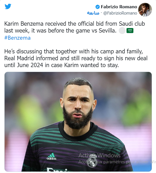 إلى جانب ذلك، قال المختص في أخبار انتقالات اللاعبين فابريزيو رومانو، إنّ بن زيمة أخبر إدارة النادي بإمكانية رحيله. في اي وقت بعدما تلقى عرضا الاسبوع الماضي من السعودية.