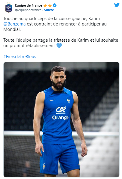 أعلنت الإتحادية الفرنسية لكرة القدم، اليوم السبت، عن الغياب الرسمي لمهاجم الديكة كريم بن زيمة عن مونديال قطر بسبب الإصابة.