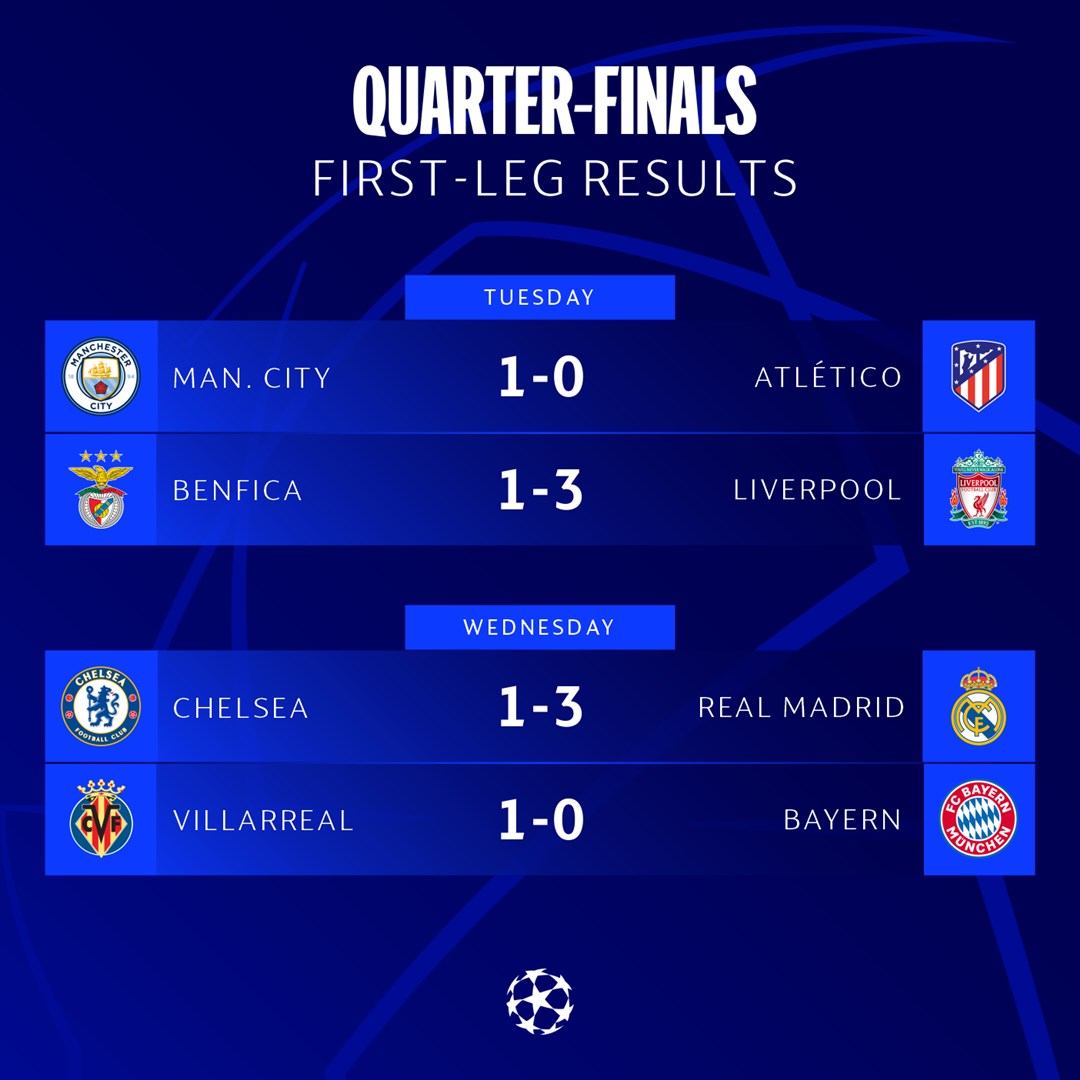 وجاءت النتائج الكاملة لذهاب الدور الربع نهائي من رابطة أبطال أورو با على النحو التالي: