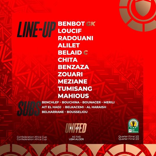 أعلن مدرب اتحاد العاصمة عبد الحق بن شيخة عن التشكيلة الأساسية التي سيعتمد عليها في مباراة اليوم أمام الجيش الملكي.