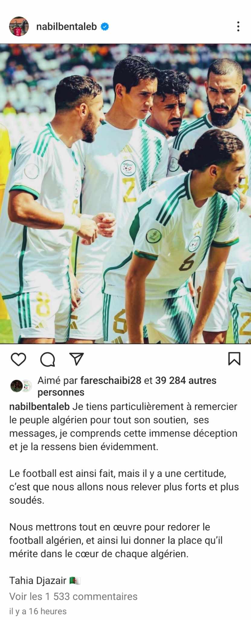 ووجّه بن طالب، شكر خاص إلى الشعب الجزائري على الدعم الكبير والرسائل التي تصله. مضيفا: “أنا أتفهم خيبة الأمل الكبيرة ومن الواضح أنني أشعر بها أيضا”.