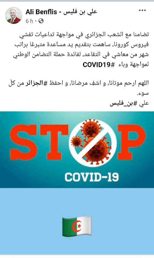 وكتب بن فليس عبر صفحته على الفيسبوك “تضامنا مع الشعب الجزائري في مواجهة تداعيات تفشي وباء كورونا”.