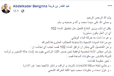 و اقترح بن قرينة، بعض التفاصيل التي يمكن ان ترافق المادة 102 قصد تجنب اَي تجاذب، بترأس مجلس الأمة شخصية توافقية