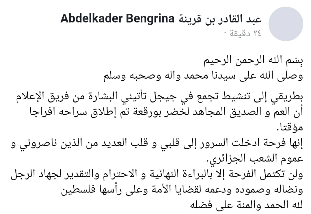 وقال بن قرينة في منشور له على”إنها فرحة أدخلت السرور إلى قلبي وقلب العديد من الذين ناصروني وعموم الشعب الجزائري”.