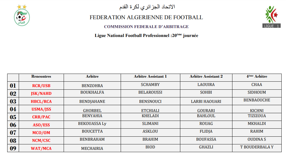 عينت لجنة التحكيم، الحكم بن يحيى، لإدارة قمة الجولة الـ 20 من البطولة المحترفة، والتي ستجمع شباب بلوزداد بنادي بارادو.