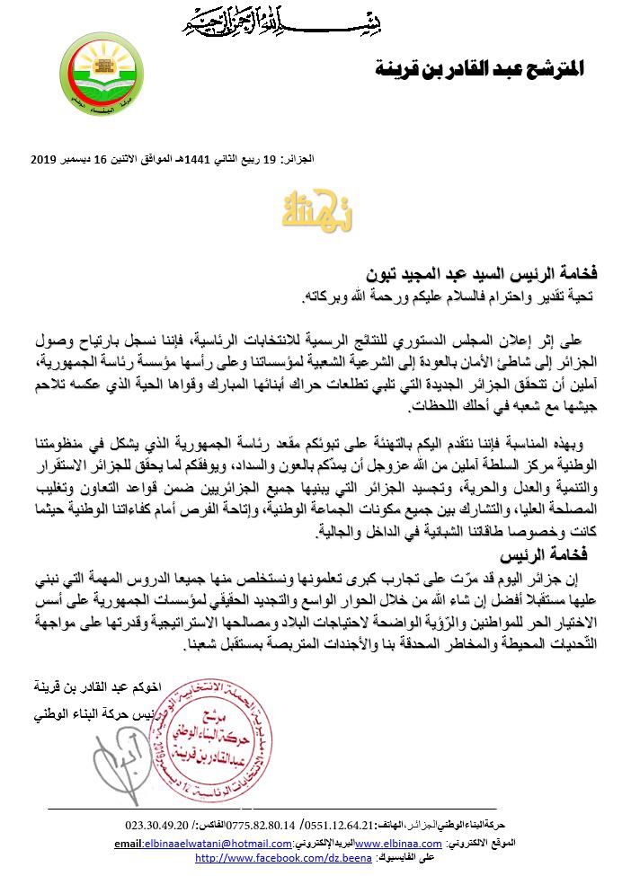 بعث المترشح للرئاسيات ورئيس حركة البناء عبد القادر بن ڨرينة برقية تهنئة للرئيس المنتخب عبد المجيد تبون بمناسبة فوزه في الرئاسيات.