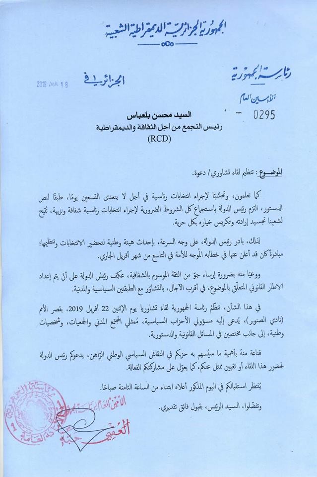 “وصلتني اليوم 21 أفريل 2019 دعوة من رئاسة الجمهورية مؤرخة يوم 18 أفريل 2019 وممضاة من طرف أمينها العام العقبي حبة”.
