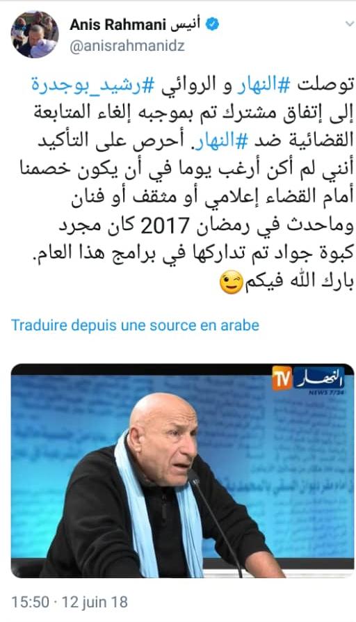 كشف الرئيس المدير العام لمجمع النهار أنيس رحماني، أن النهار تمكنت من الوصول إلى إتفاق مع الروائي رشيد بوجدرة.