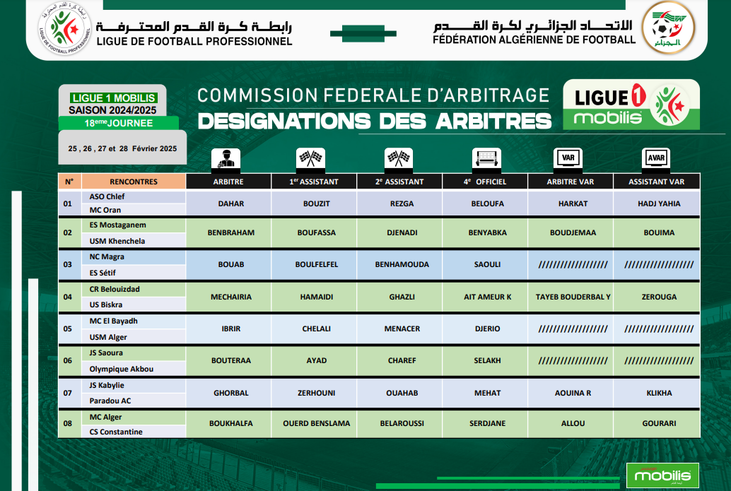 كشف الاتحاد الجزائري لكرة القدم “الفاف”، اليوم الأحد، عن تعيينات حكام مباريات الجولة الـ18 من البطولة المحترفة.