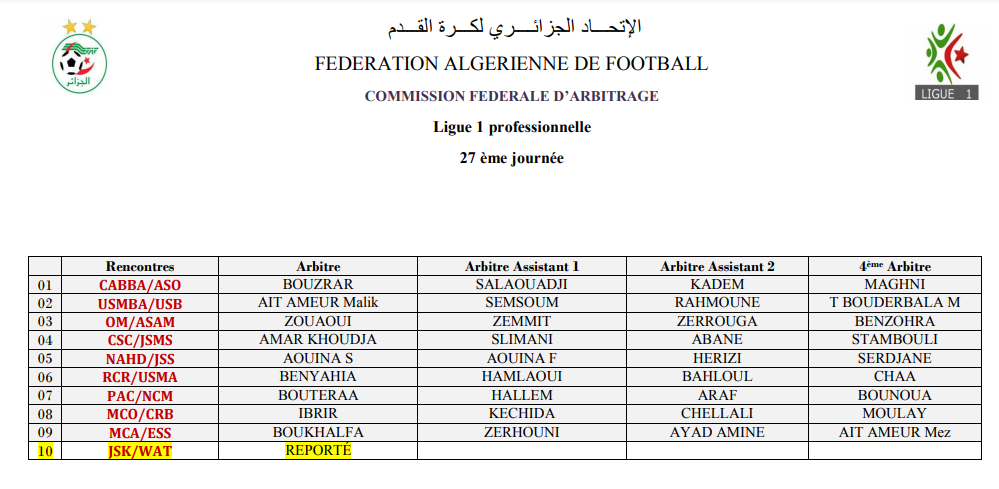 وكشف الموقع الرسمي للاتحاد الجزائري لكرة القدم، التعيينات الكاملة لحكام هذه الجولة، والتي جاءت على النحو التالي: